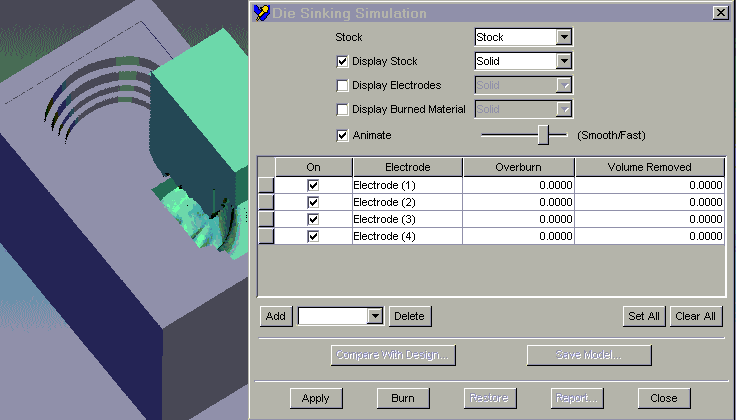 You may not have “problems” with your die sinking operations, but if you’re spending time avoiding them, you’re wasting time!Using VERICUT “as machined” solid models of the rough machined mold components and machined electrodes used to produce the completed mold tooling, the results of the plunge/ram sinking operations are just like the machine!EDM Die Sinking offers several different views of the burn process, including display of the rough machined stock, the electrodes, and the burn material (material removed by the electrodes). All can be displayed, hidden, or displayed translucent. The burn process also displays the volume removed by each electrode, and allows specification of an “overburn” offset on each electrode.