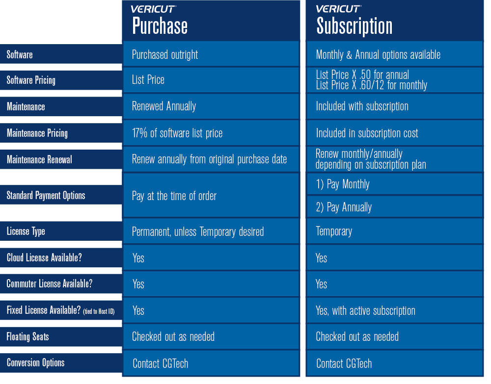 A VERICUT Subscription includes the software and any additional modules in your Subscription Plan as long as your Subscription is Active. Maintenance is included in the monthly/annual renewal cost, so you will always have access to the latest version of VERICUT and receive Tech Support as long as the Subscription is Active.