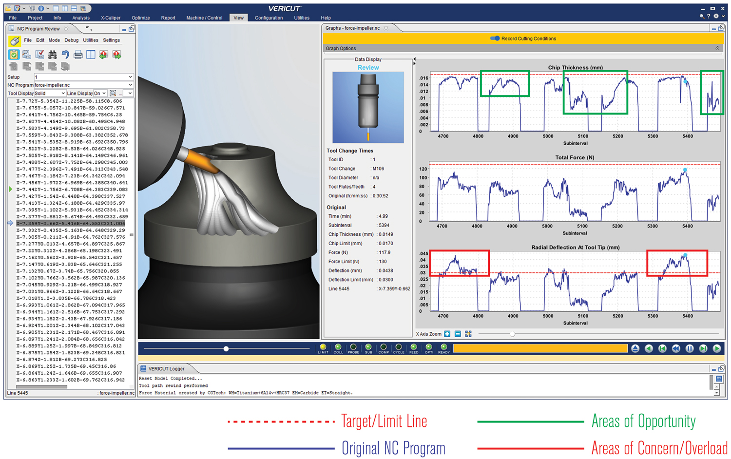 The Force Analysis module enables users to graphically analyze cutting conditions generated by an NC program against selected target values to reveal areas of opportunity and areas of concern.