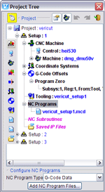 The Project Tree, first introduced in VERICUT 6.0, continues to be refined to make your VERICUT sessions simple to set up. A shortcut Toolbar has been added to enable you to quickly go to a particular Project Tree branch. You can hold the cursor over the icons to see what branch the icon goes to. Model file names are shown in parentheses for all models that have model files associated with them. Double clicking on NC Programs, or NC Subroutines, displays the appropriate file selection window. Also, NC Programs and NC Subroutine files can be added by simply right-clicking in the Project Tree.