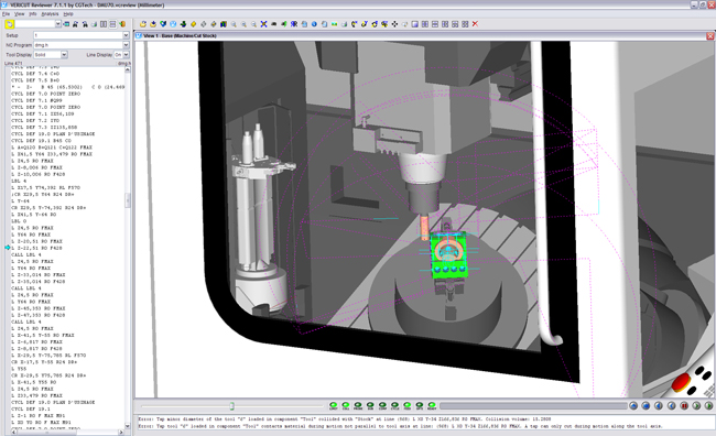 A new feature has been added for VERICUT collision checking: you can now stop the simulation at an “exact” collision point between the machine components. The new feature is turned on/off using the new Stop At Collision check box on the Start/Stop panel. The new logic is applied only to the Machine Simulation collision checking, and only to machine components other than the STOCK component. It is not applied to the holder/stock and tool/fixture collision checks. While simulating a NC block with the Stop At Collision box checked, VERICUT will stop in mid-motion at each collision point. Clicking the Step button continues simulation to the next collision point (or to the end of the motion if no other collisions exist).