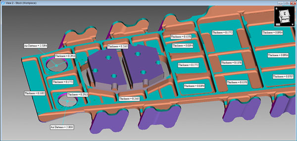 The X-Caliper measuring tool quickly creates a measurement label on the VERICUT cut stock. Label placement is customizable by the end user for optimal viewing. To aid inspection, multiple dimensions are easily displayed on the part to quickly document key measurements. Images with dimensions are referenced in VERICUT reports.