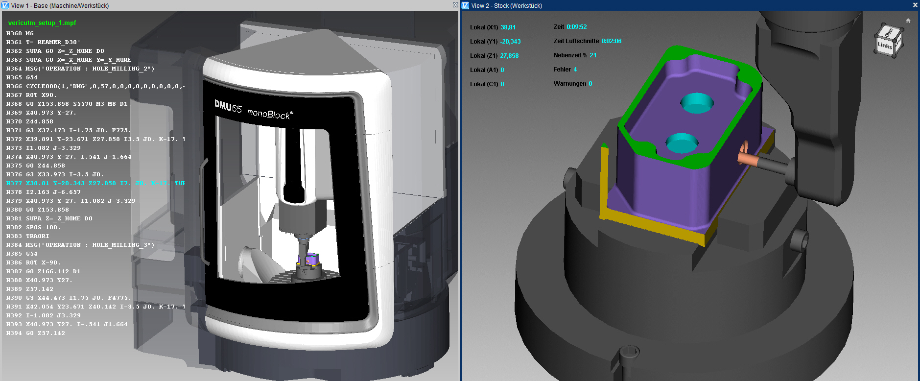 Head-Up Display (HUD) shows the NC program or status items on top of Views. HUD keeps tabs on the NC program and important machine functions, while still keeping simulation Views as large as possible for optimal viewing. HUD is customizable.
