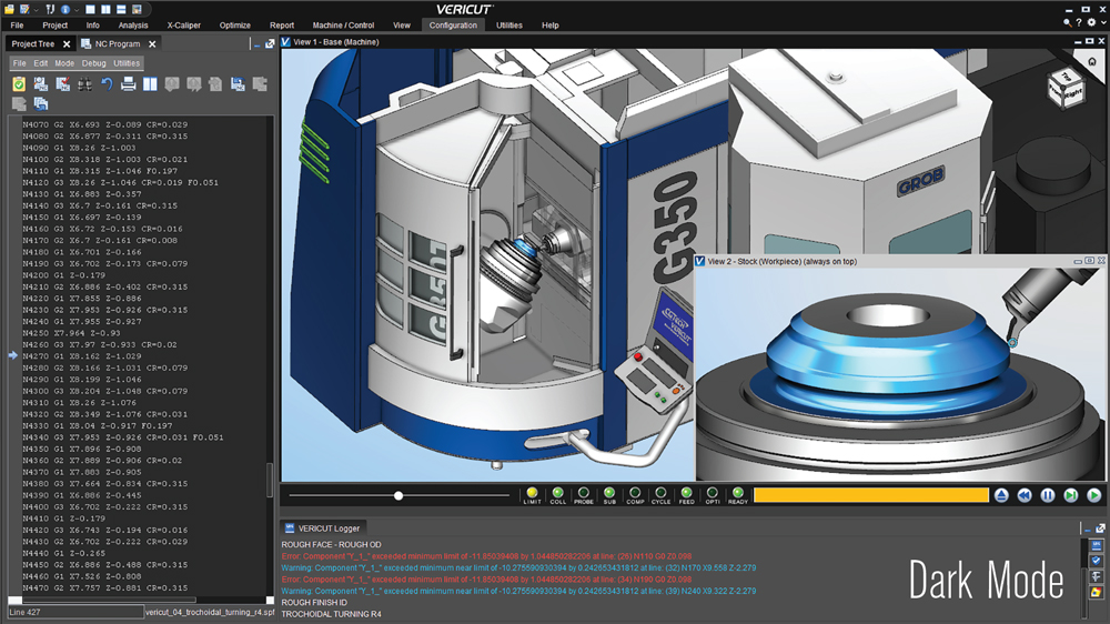 VERICUT offers a Dark Mode color theme for users that prefer darker colors to ease eye strain and provide more striking views of the simulation.