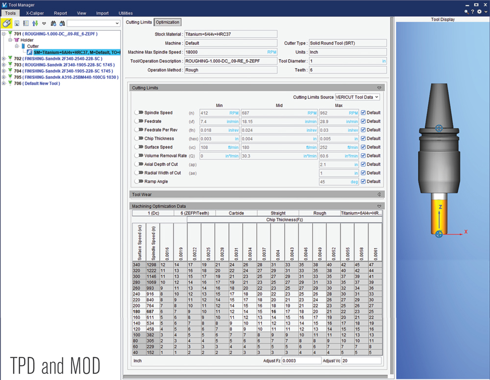 Tool Manager includes a Tool Performance Database (TPD) that suggests starting spindle speed and feed rate values to use with cutters in a wide range of stock materials. This data works with Machining Optimization Data (MOD) in VERICUT’s Tool Manager. MOD displays a table of spindle speeds and feed rates that helps programmers achieve desired cutting conditions.