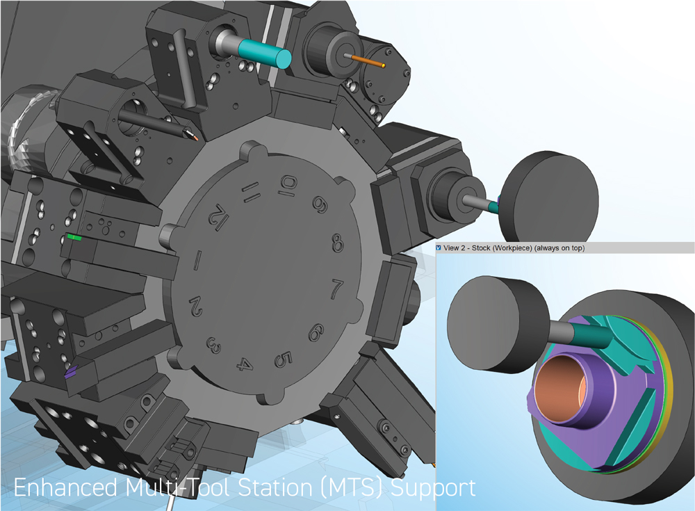 Enhanced support for NC programs and machines that utilize tools mounted in multi-tool stations (MTS). For each tool (known as a SubTool) mounted in an MTS, users can:
