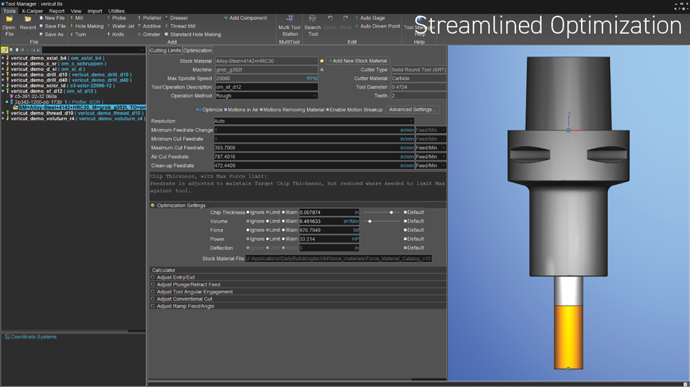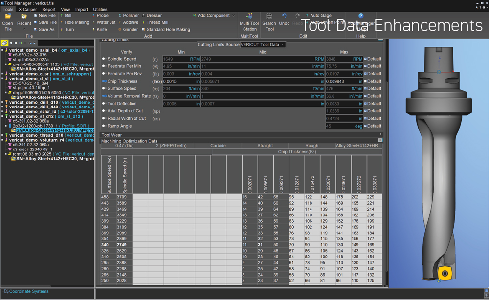 VERICUT Tool Data gives users an opportunity to quickly optimize their NC programs, without having to search for starting values when it comes to materials and cutting tool parameters. Users can also import cutting data with cutting tool assemblies, such as those from tool vendor sites and repositories like MachiningCloud, TDM, ZOLLER and more.